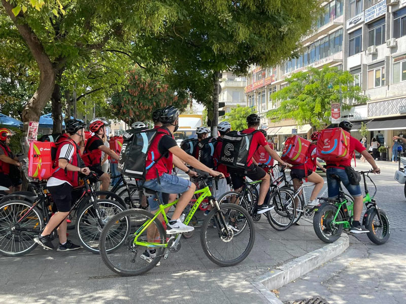 Μετά τη 1 το μεσημέρι οι εργαζόμενοι διανομείς με ποδήλατα, ηλεκτρικά πατίνια και μηχανάκια ξεκίνησαν από την Κεντρική Πλατεία και διέσχισαν κεντρικούς δρόμους της πόλης κάνοντας αισθητή την παρουσία τους με κορναρίσματα. Το ίδιο συνέβει και στην Αθήνα όπου με μεγάλη μοτοπορεία οι εργαζόμενοι περάσανε από το Σύνταγμα και την Πανεπιστημίου