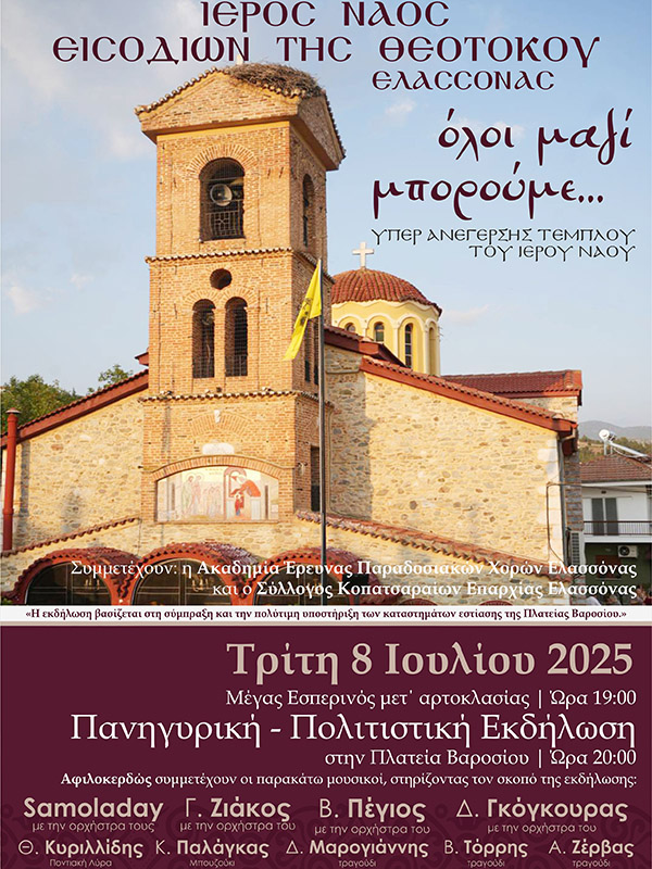 Μέγας Εσπερινός & Εκδήλωση Στήριξης του Ι.Ν. Εισοδίων – 8 Ιουλίου στο Βαρόσι