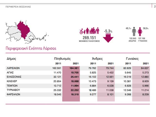 Συγκεκριμένα στην Περιφερειακή Ενότητα Λάρισας 269.151 είναι ο μόνιμος πληθυσμός 132.043 άντρες και 137.108 γυναίκες.