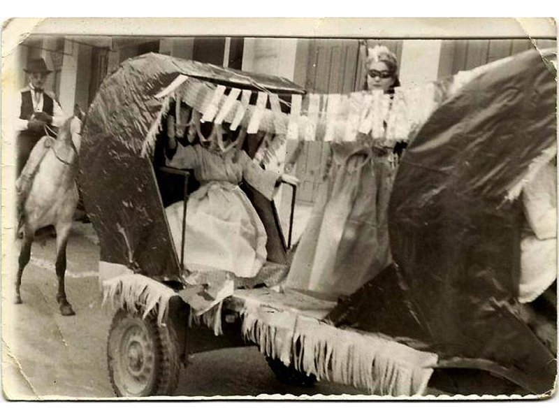 Στην φωτογραφία βλέπουμε καθιστή μέσα στο άρμα την 1η βασίλισσα του τότε Καρναβαλιού, την κα Ευαγγελία Μπρέζα, μητέρα του Θωμά Κυριάκου.