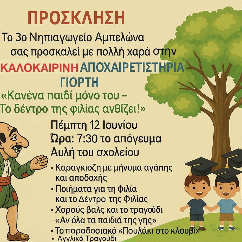 Με ιδιαίτερη χαρά και ενθουσιασμό, το 3ο Νηπιαγωγείο Αμπελώνα προσκαλεί γονείς, φίλους και μέλη της τοπικής κοινωνίας στην Καλοκαιρινή Αποχαιρετιστήρια Γιορτή που διοργανώνει με τίτλο: