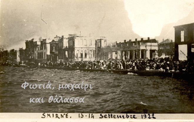 Από το κατάστρωμα του Iron Duke κοιτάζαμε στο κοντινό μας άπειρο την αναλαμπή από τη φωτιά της Σμύρνης… Είδαμε έντρομους ανθρώπους να πέφτουν στη θάλασσα, βάρκες να αναποδογυρίζουν, να βουλιάζουν από το βάρος… Έτσι ξεριζώνονται λοιπόν οι λαοί σκέφτηκα…