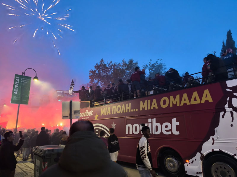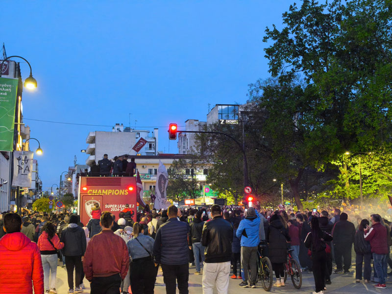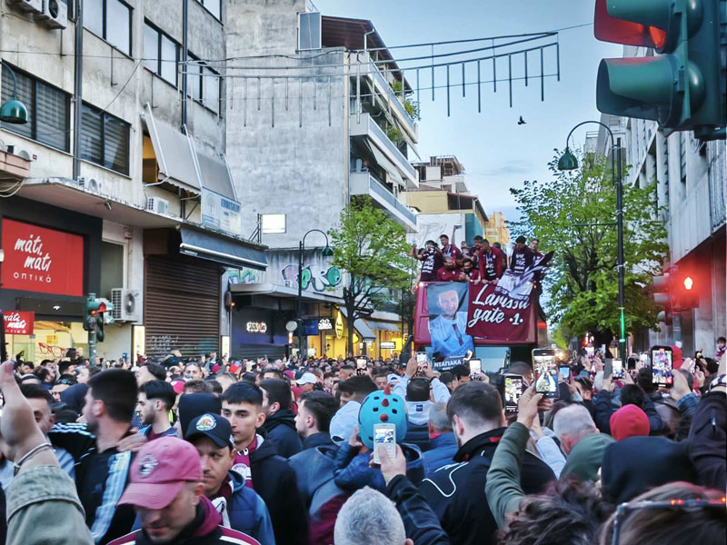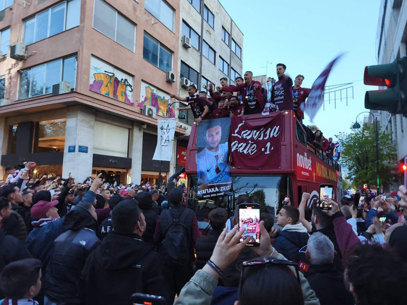 Το ανοιχτό πούλμαν της ομάδας διέσχισε τους δρόμους της Λάρισας μέσα σε λαοθάλασσα, με τον κόσμο να το συνοδεύει σαν ποτάμι περηφάνειας και συγκίνησης. Κόρνες, καπνογόνα, σημαίες, τραγούδια, αγκαλιές, δάκρυα… Η πλατεία έσφυζε από ζωή. Οι Λαρισαίοι κάθε ηλικίας, από πιτσιρίκια με φανέλες μέχρι γιαγιάδες που μεγάλωσαν με την ΑΕΛ, ενώθηκαν σε μια αγκαλιά.