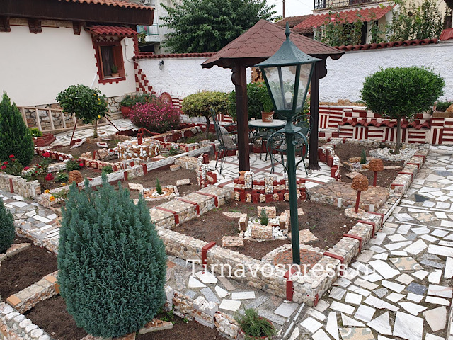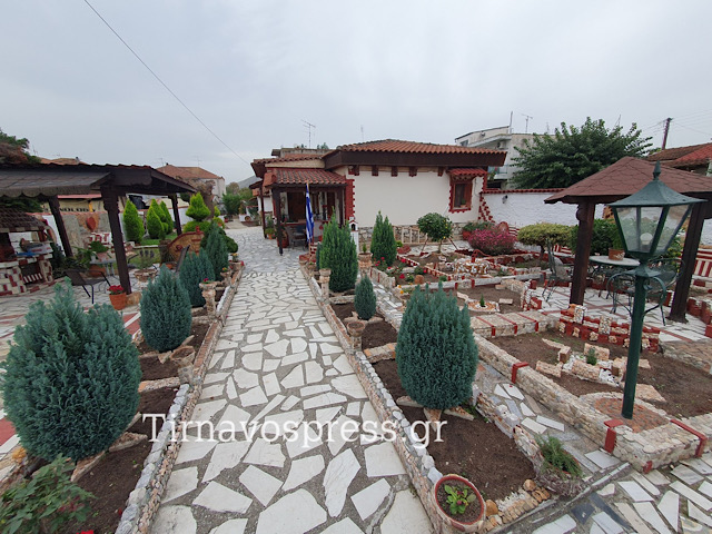 Η παραδοσιακή αυλή του κ. Παναγιώτη φτιάχτηκε πέτρα πέτρα από τον ίδιο με μεράκι και σεβασμό στην παράδοση του Τυρνάβου. Ο κ. Παναγιώτης με το ποδήλατο του μετέφερε καθημερινά πέτρες από τον Προφήτη Ηλία Τύρνάβου και τον Ξηρια (Τιταρήσιος) μέχρι που μετατράπηκε σε μια αυλή βγαλμένη από άλλη εποχή.