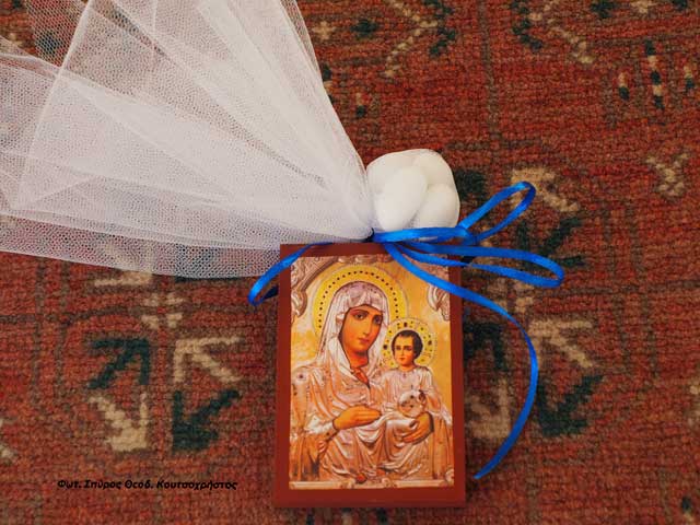 Μια μικρή ξύλινη εικόνα, με την Παναγία να κρατά στην αγκαλιά της τον Χριστό και ένα τούλι κουφέτα ήταν η μπομπονιέρα του νεοφώτιστου Μάριου, κάτι που επίσης δεν πρέπει να παραβλέψουμε.
