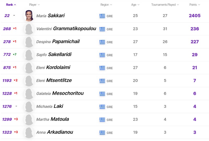 Στο Νο.268 του κόσμου βρίσκεται η Βαλεντίνη Γραμματικοπούλου και στο Νο.278 η Δέσποινα Παπαμιχαήλ. Η 17χρονη Σαπφώ Σακελλαρίδη είναι στο Νο.772 με 29 βαθμούς και η Ελένη Κορδολαίμη στο Νο.875 με 21 βαθμούς.