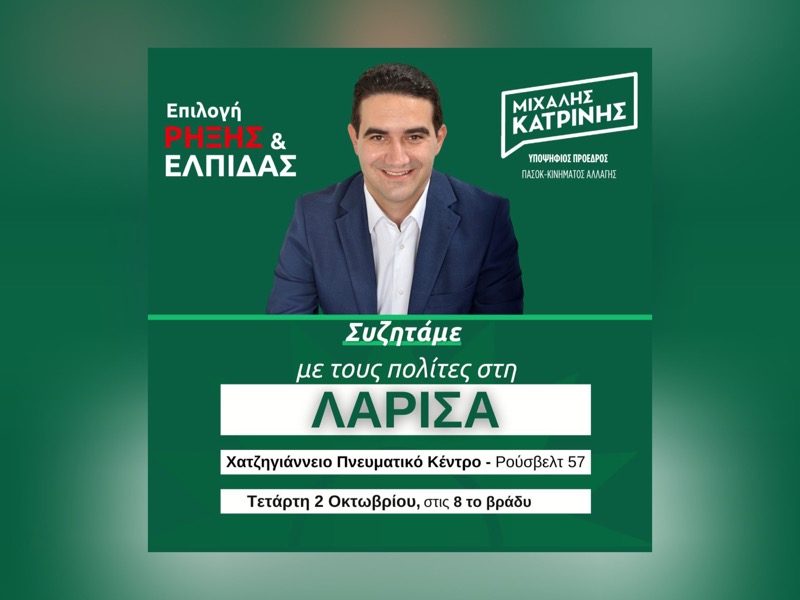 Με το μήνυμα «Συζητάμε με τους πολίτες» ο Μιχάλης Κατρίνης διοργανώνει ανοιχτή συγκέντρωση και συζήτηση με τους πολίτες στις 20.00 στη Λάρισα, στο Χατζηγιάννειο Πνευματικό Κέντρο, Ρούσβελτ 57.
