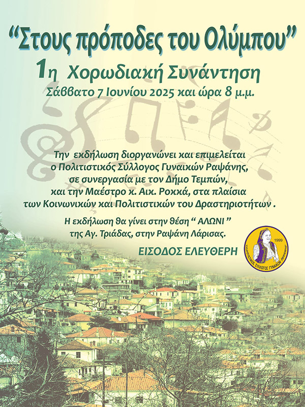 η οποία διοργανώνεται από τον Πολιτιστικό Σύλλογο Γυναικών Ραψάνης σε συνεργασία με τον Δήμο Τεμπών και τη μαέστρο της Μικτής Χορωδίας του Πολιτιστικού Συλλόγου Γυναικών Ραψάνης κα Αικατερίνη Ροκκά.