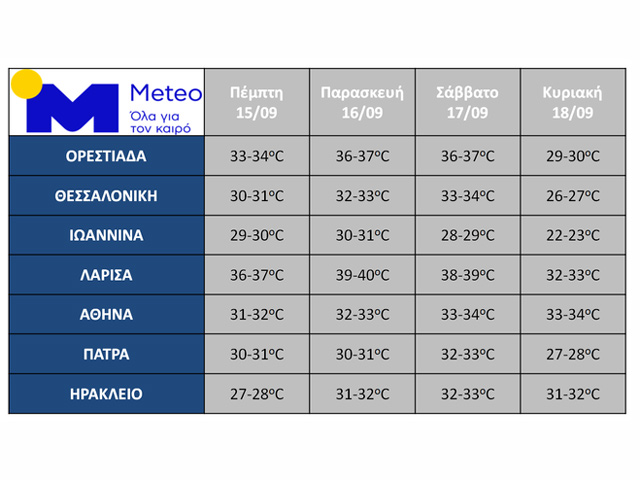 Στον σχετικό πίνακα παρουσιάζονται οι μέγιστες θερμοκρασίες που αναμένονται σε 7 μεγάλες πόλεις της χώρας από σήμερα Πέμπτη 15/09 έως και την Κυριακή 18/09.