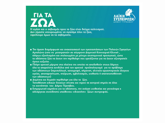 Μήνυμα της Λαϊκής Συσπείρωσης Δήμου Τυρνάβου για την Παγκόσμια Ημέρα Ζώων