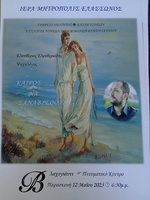 Η Ιερά Μητρόπολις Ελασσώνος σε συνεργασία με τον Σύλλογο Γονέων και Κηδεμόνων του Δημοτικού Σχολείου Βλαχογιαννίου συνδιοργανώνουν στο πνευματικό κέντρο του Ιερού Ναού Αγίας Τριάδος Βλαχογιαννίου ομιλία με το γνωστό Ψυχολόγο κ. Ελευθέριο Ελευθεριάδη με θέμα: Καιρός να ξαναβρεθούμε.