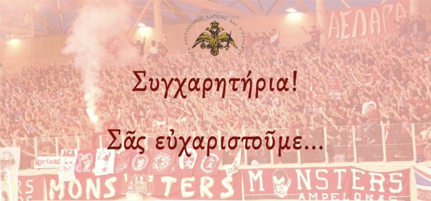 Ευχαριστούμε γι αυτό τους παίκτες μας, την προπονητική ομάδα, τον Πρόεδρο και το Διοικητικό Επιτελείο, καθώς και όλους τους παράγοντες της πόλης μας ,που με κάθε μέσο στήριξαν την ομάδα στη μεγάλη της αυτή και αναγκαία για την ψυχολογία της κοινωνίας μας επιτυχία.