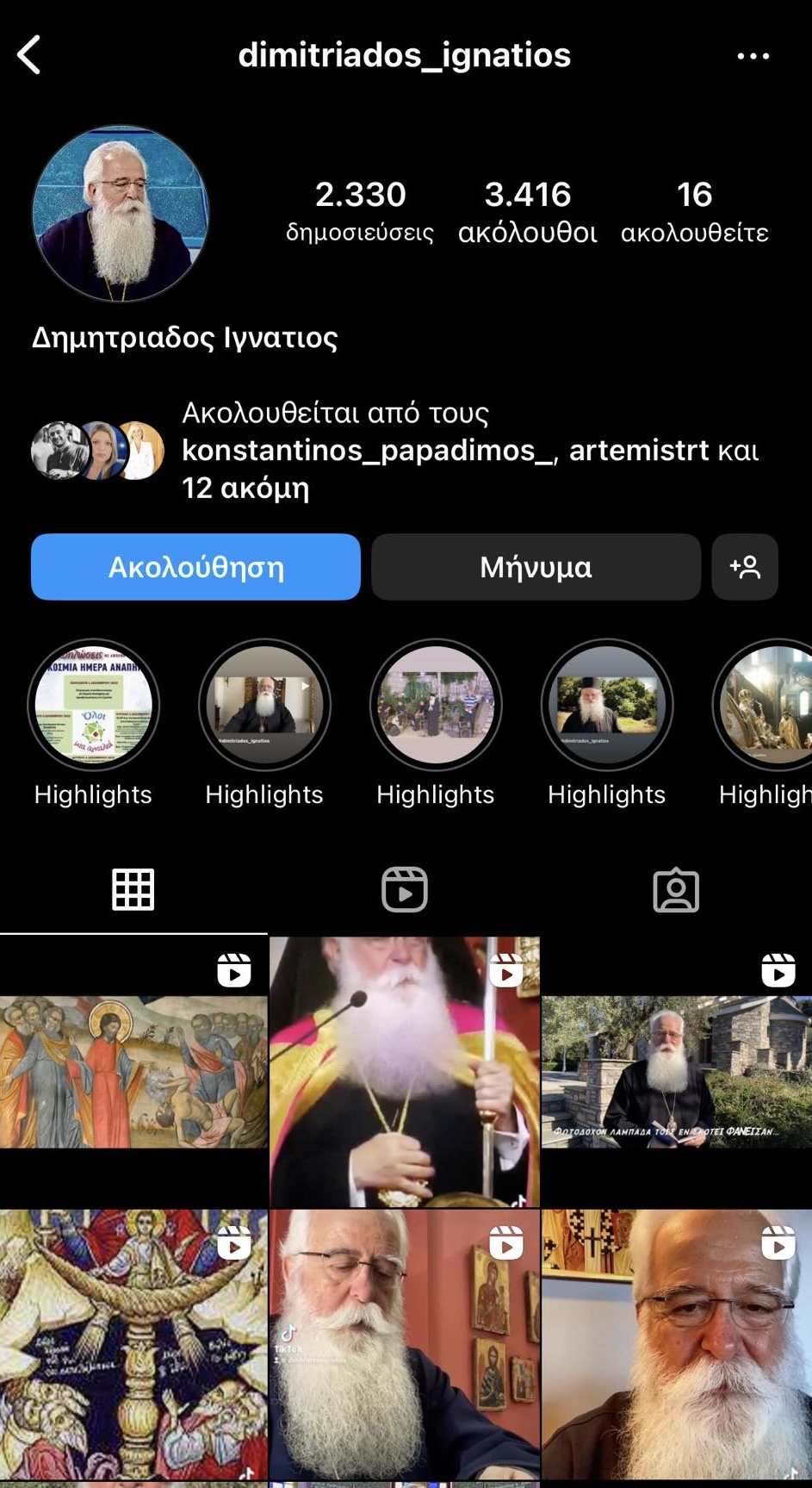 Στο δημοφιλέστερο TIK TOK ο κ. Ιγνάτιος διαθέτει 16.633 ακολούθους και 418.735 μου αρέσει σε δεκάδες βίντεο που έχει ανεβάσει. Ο ίδιος κηρύσσει τον λόγο του Θεού μέσω της κάμερας, ενώ περνάει και τα μηνύματά του απευθυνόμενος στο κοινό.