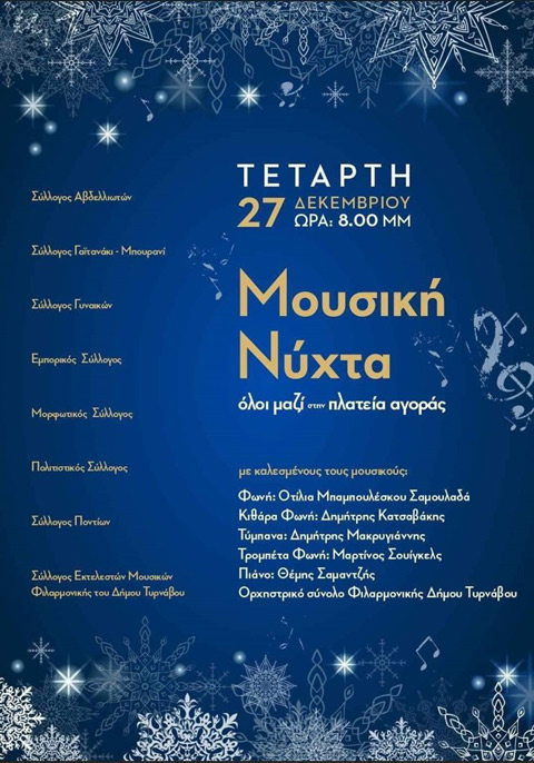 Την Τετάρτη 27 Δεκεμβρίου στις 8 το βράδυ ο Εμπορικός Σύλλογος, ο Σύλλογος Αβδελλιωτών η «Βασιλίτσα», ο Σύλλογος Γυναικών, ο Μορφωτικός Σύλλογος , ο Πολιτιστικός Σύλλογος, ο Σύλλογος Γαϊτανάκι – Μπουρανί, ο Σύλλογος Ποντίων και ο Σύλλογος Εκτελεστών Μουσικών της Φιλαρμονικής του Δήμου Τυρνάβου συνδιοργανώνουν εκδήλωση στην Πλατεία Αγοράς.