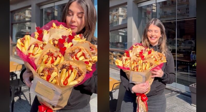 Η ημέρα του Αγίου Βαλεντίνου έκανε πολλούς επιχειρηματίες να πρωτοτυπήσουν. Όπως έναν ιδιοκτήτη σουβλατζίδικου, που σκέφτηκε να δημιουργήσει ένα μπουκέτο διαφορετικό από πιτόγυρα…
