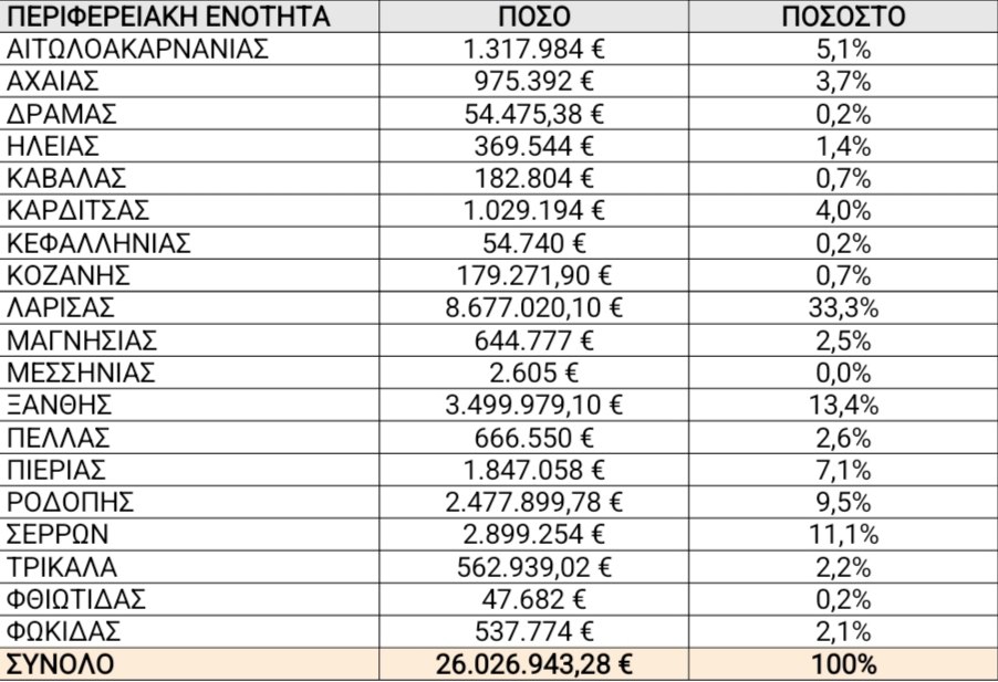 Η νέα κατανομή αποζημιώσεων ενισχύει εκ νέου τη Θεσσαλία, η οποία λαμβάνει το 33% (10.913.930,12 €), και κυρίως τη Λάρισα (8.677.020,10 €).