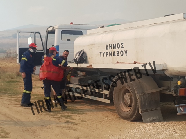 Στην φωτιά επιχειρούν πεζοπόρα τμήματα με 5 άντρες, 4 οχήματα της Πυροσβεστικής, 2 εσκαφείς από τον Δήμο Τεμπών και η υδροφόρα του Δήμου Τυρνάβου με τον Γιάννη Ταουσάνη.