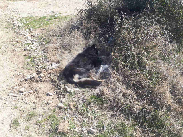 Ένα νεκρό ζώο δίπλα σε επικίνδυνα τοξικά σκουπίδια, σε παράνομη χωματερή από αγρότες στο Δαμάσι.