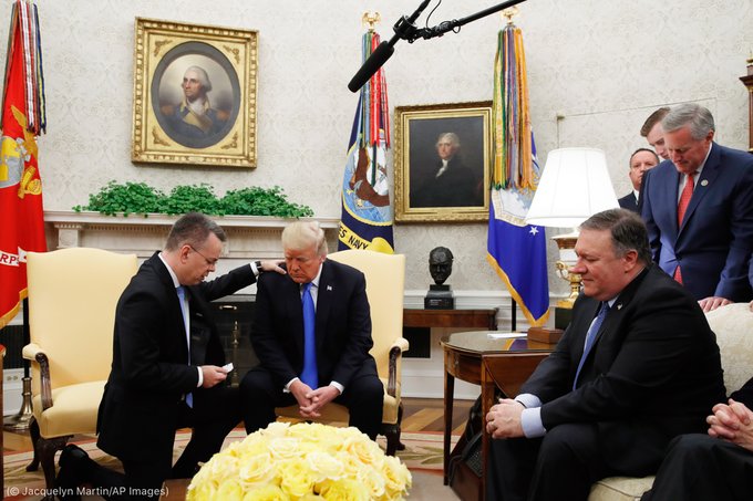 Ο κ. Πομπέο δημοσίευσε στο λογαριασμό του στο Twitter φωτογραφίες του Αμερικανού Πάστορα Άντριου Μπράνσον, ο οποίος κρατήθηκε στις σκληρές τουρκικές φυλακές στη Σμύρνη, με ανυπόστατες κατηγορίες. Κατηγορήθηκε ότι συμμετείχε στο σικέ πραξικόπημα του Ταγίπ Ερντογάν και ότι συνεργαζόταν με τους Κούρδους αντάρτες του PKK.