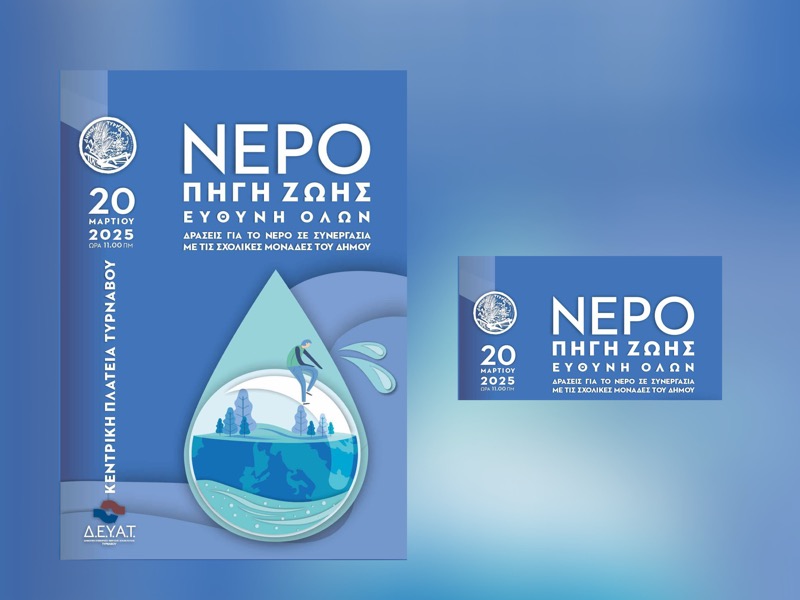 Στο πλαίσιο εορτασμού της Παγκόσμιας Ημέρας Νερού, ο Δήμος Τυρνάβου σε συνεργασία με την Δ.Ε.Υ.Α. Τυρνάβου, διοργανώνει δράση με τίτλο «Νερό: Πηγή Ζωής, Ευθύνη Όλων», που θα πραγματοποιηθεί στις 20 Μαρτίου 2025 στην Κεντρική Πλατεία Τυρνάβου, ώρα 11:00 π.μ.