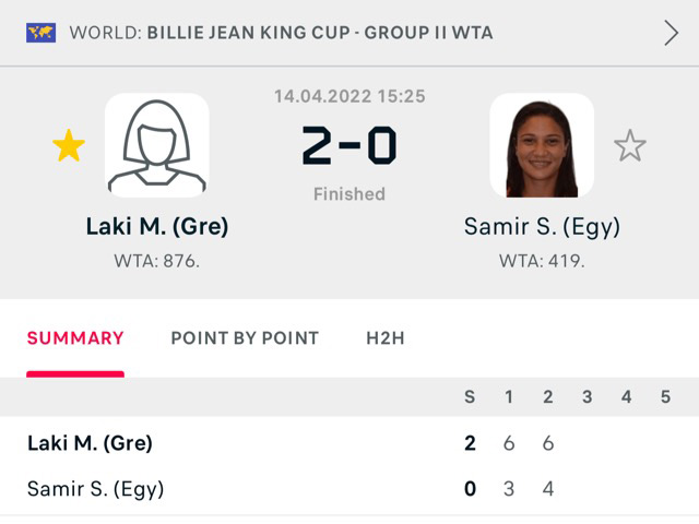 Η Μιχαέλα ”έσκισε” στον αγώνα με την πολύ δυνατή παίκτρια της Αιγύπτου με 6-3, 6-4 και χάρισε στην Ελλάδα το 1-0 επί της Αιγύπτου, στα πλαίσια της φάση των ομίλων του τουρνουά της 2ης κατηγορίας της Ευρωαφρικανικής ζώνης του Billie Jean King Cup.