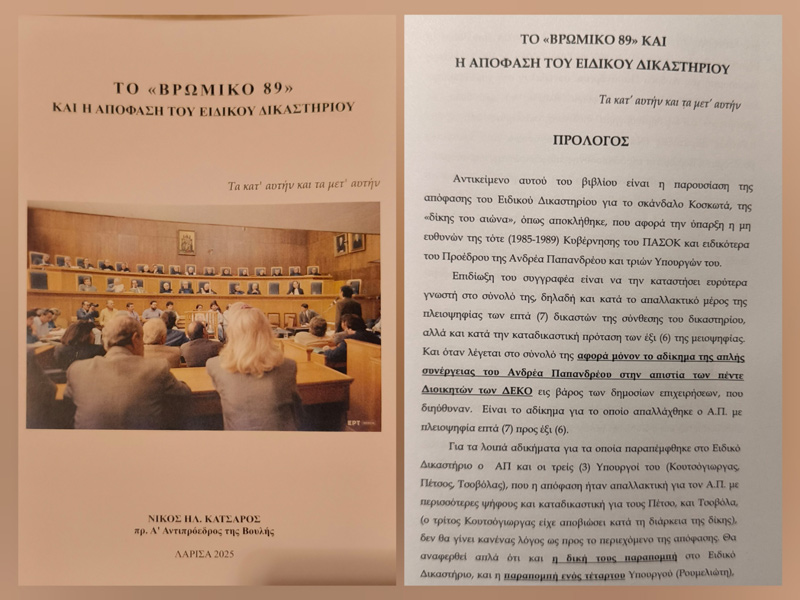 Ο πρώην Αντιπρόεδρος της Βουλής, Νίκος Κατσαρός, μία από τις πιο εμβληματικές φυσιογνωμίες της νεότερης πολιτικής ιστορίας της χώρας, μιλά αποκλειστικά στο TirnavosPress.gr με αφορμή το νέο του βιβλίο «Το Βρώμικο ’89 και η απόφαση του Ειδικού Δικαστηρίου: τα κατ’ αυτήν και μετ’ αυτήν», ένα έργο που επαναφέρει στο προσκήνιο τη δίκη του αιώνα – την υπόθεση Κοσκωτά και τις ευθύνες της τότε κυβέρνησης του ΠΑΣΟΚ.