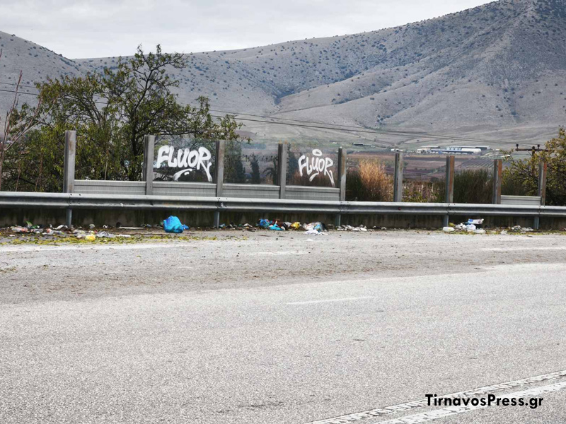 Ο κόμβος του Τυρνάβου στην εθνική οδό Λάρισας – Κοζάνης, μια από τις κύριες αρτηρίες της Θεσσαλίας, έχει μετατραπεί σε σκουπιδότοπο.