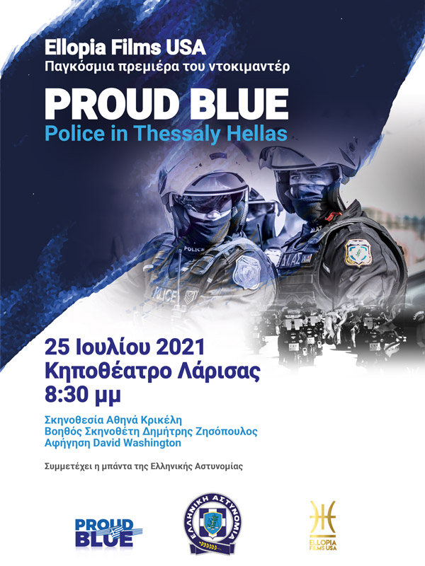 Την Κυριακή 25 Ιουλίου 2021 και ώρα 20.30΄ στο Κηποθέατρο Λάρισας (εντός πάρκου Αλκαζάρ), θα πραγματοποιηθεί η Παγκόσμια Πρεμιέρα προβολής του ντοκιμαντέρ με τίτλο «PROUD BLUE» (ΠΕΡΗΦΑΝΟ ΜΠΛΕ), το οποίο επικεντρώνεται στις δραστηριότητες και το έργο των αστυνομικών που υπηρετούν σε Υπηρεσίες της Γενικής Περιφερειακής Αστυνομικής Διεύθυνσης Θεσσαλίας.