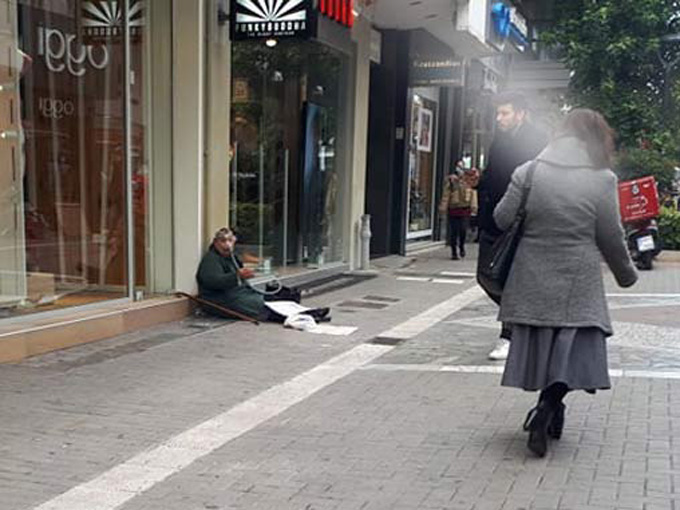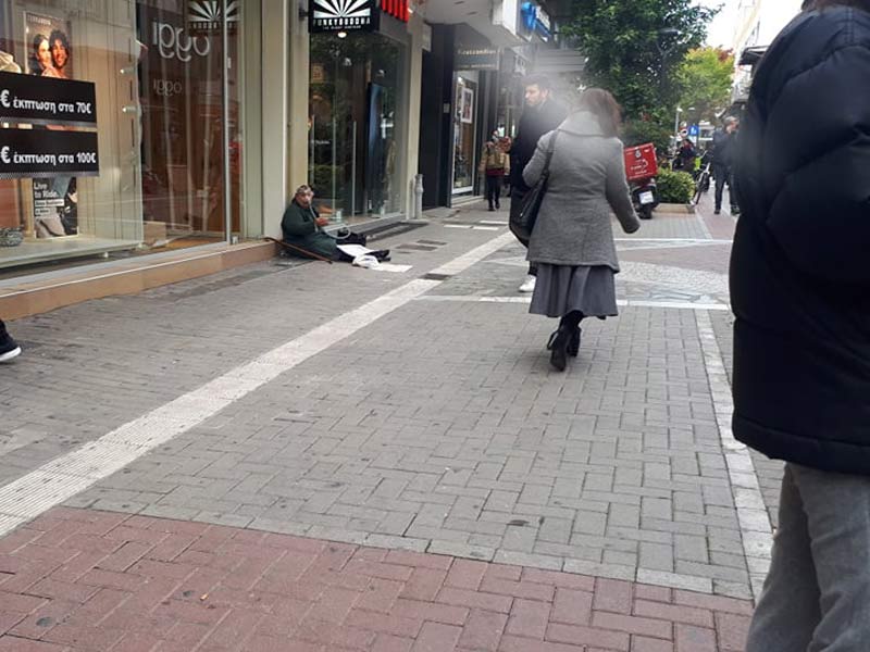 Καθισμένη κάτω μπροστά σε πολυτελή καταστήματα στο πεζόδρομο της Ερμού, είναι ντροπή για την κοινωνία μας και τις δομές που υποτίθεται μεριμνούν σε τέτοιες καταστάσεις.