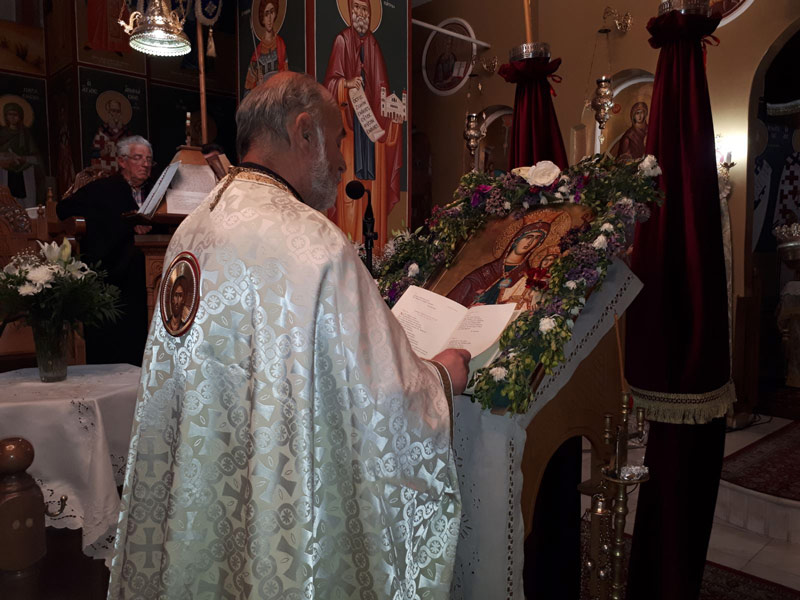Την ακολουθία τέλεσε ο πάτερ Γεώργιος με την συνοδεία του δεξιά Πρωτοψάλτη Μέμτσα Βασιλείου και Κοκοτσιου Θεόδωρος ενώ αριστερά Ζαρογιάννης Κλεάνθης.