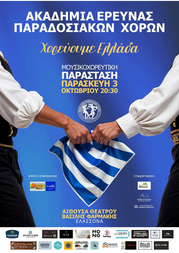 Ο Δήμος Ελασσόνας τιμά την παράδοση και τον πολιτισμό στηρίζοντας τη μεγάλη μουσικοχορευτική παράσταση «Χορεύουμε Ελλάδα», που θα παρουσιαστεί την Παρασκευή 3 Οκτωβρίου 2025 και ώρα 20:30 στην Αίθουσα Θεάτρου «Δημάρχου Βασ. Φαρμάκη», στο πλαίσιο των εκδηλώσεων «ΕΛΕΥΘΕΡΙΑ 2025», από την Ακαδημία Έρευνας Παραδοσιακών Χορών, με τη συνδιοργάνωση της Περιφέρειας Θεσσαλίας και της Π.Ε.Δ Θεσσαλίας.