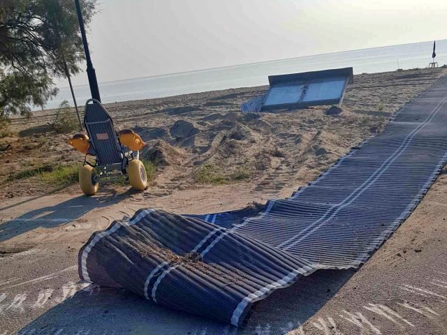 Με μηχάνημα έργου (Μπουλντόζα) που ήταν σταθμευμένο σε παρακείμενο οικόπεδο και έθεσαν σε λειτουργία προκάλεσαν εκτεταμένες ζημιές στο χώρο της παραλίας. Ξεριζώσανε δένδρα, κατέστρεψαν ράμπες για άτομα με αναπηρία, ντουζιέρες, πίνακες ανακοινώσεων, παγκάκια, πλαστικό θάλαμο αποδυτηρίων ατόμων με αναπηρία και καταστροφή του οδοστρώματος.»