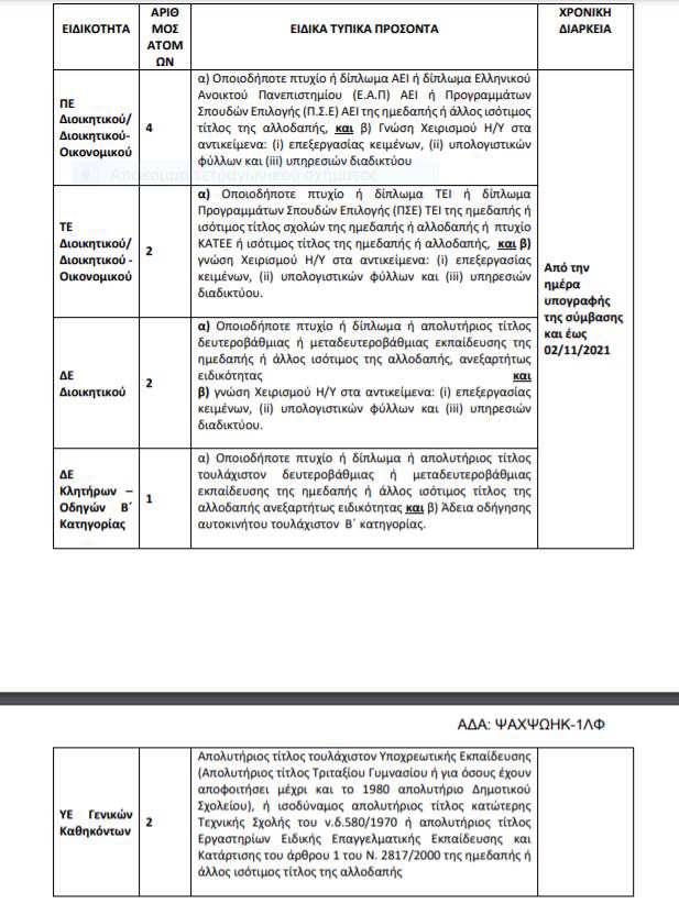 Την πρόσληψη, με σύμβαση εργασίας ιδιωτικού δικαίου ορισμένου χρόνου, συνολικά έντεκα (11) ατόμων για την αντιμετώπιση των απρόβλεπτων, εκτάκτων και κατεπειγουσών αναγκών του Δήμου Τυρνάβου που οφείλονται στο σεισμό της 03ης/03/2021, αποτέλεσμα του οποίου ήταν η κήρυξη του Δήμου σε κατάσταση έκτακτης ανάγκης. Οι θέσεις, για τις εξής κατά αριθμό ατόμων, ειδικότητες, με τα αντίστοιχα ειδικά τυπικά προσόντα και χρονική περίοδο: