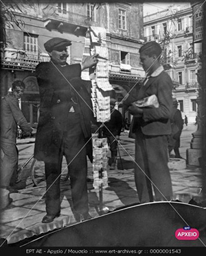 Αθήνα — Περαστικός αγοράζει λαχείο από λαχειοπώλη. Συλλογή Πέτρου Πουλίδη – Πρωτότυπο Μέσο: Γυάλινη Πλάκα – Διαστάσεις: 9 x 12 – Χρονολογία Λήψης 01/01/1920 – 31/12/1939