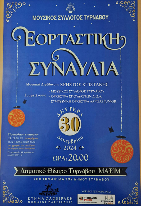 Ο Μουσικός Σύλλογος Τυρνάβου σας προσκαλεί στην καθιερωμένη εορταστική του συναυλία τη Δευτέρα 30 Δεκεμβρίου στις 8 το βράδυ στο Δημοτικό θέατρο Μαξίμ.