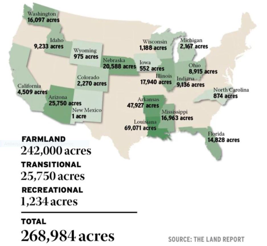 Ο δισεκατομμυριούχος – η περιουσία του οποίου, σύμφωνα με το Forbes, ανέρχεται σε 121 δισ. δολάρια – έχει πλέον στην κατοχή του ένα τεράστιο αριθμό γεωργικών εκτάσεων που εκτείνεται σε 19 πολιτείες. Η συνολική έκταση που κατέχει είναι 269.000 έικρ (acres) ή 1.077.000 στρέμματα.