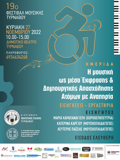Ο Πολιτιστικός Σύλλογος Τυρνάβου στα πλαίσια του 19ου Φεστιβάλ Μουσικής Τυρνάβου και με την ευκαιρία της Παγκόσμιας Ημέρας Ατόμων με Αναπηρία διοργανώνει Ημερίδα με θέμα “Η Μουσική ως Μέσο Έκφρασης και Δημιουργικής Απασχόλησης Ατόμων με Αναπηρία“.