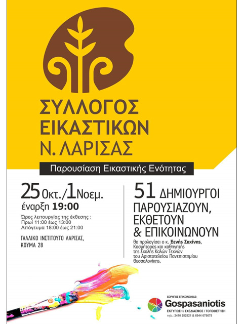 O Σύλλογος Εικαστικών Ν. Λάρισας, θα πραγματοποιήσει έκθεση εικαστικών δημιουργημάτων με τίτλο, «51 ΔΗΜΙΟΥΡΓΟΙ ΠΑΡΟΥΣΙΑΖΟΥΝ, ΕΚΘΕΤΟΥΝ & ΕΠΙΚΟΙΝΩΝΟΥΝ», από Τρίτη 25 Οκτωβρίου έως και Τρίτη 1 Νοεμβρίου 2022 στο Γαλλικό Ινστιτούτο Λάρισας.