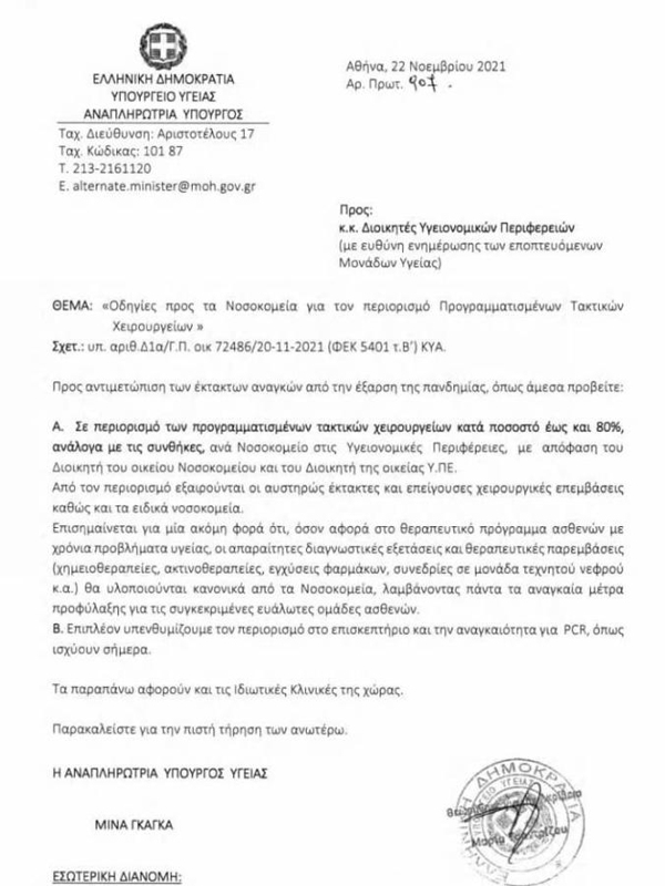 Με εσωτερικό έγγραφο που υπογράφεται από την αναπληρώτρια υπουργό Υγείας Μίνα Γκάγκα, δίνεται οδηγία στα νοσοκομεία για τον περιορισμό των προγραμματισμένων τακτικών χειρουργείων έως και 80%.