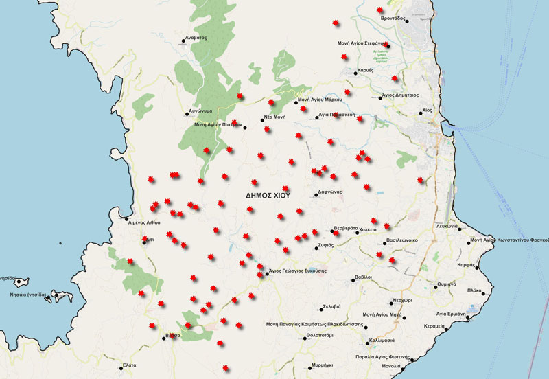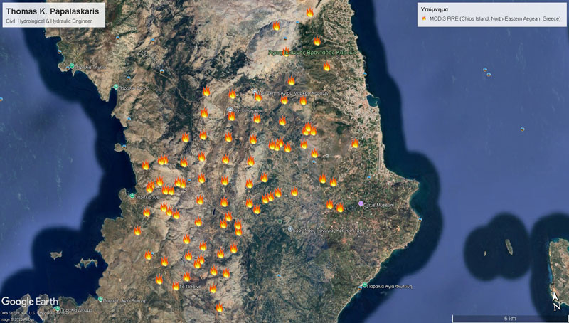 Στην παρακάτω εικόνα απεικονίζονται στοιχεία από τις πρόσφατες φωτιές στην «Χίο», («85 πύρινες εστίες», «22-24/06/2025»), με την χρήση στοιχείων από την «Nasa» και με την χρήση «Γεωγραφικών Πληροφοριακών Συστημάτων (“Γ.Π.Σ.”)» και με την χρήση του ελεύθερου διαδικτυακού λογισμικού «Google Earth».