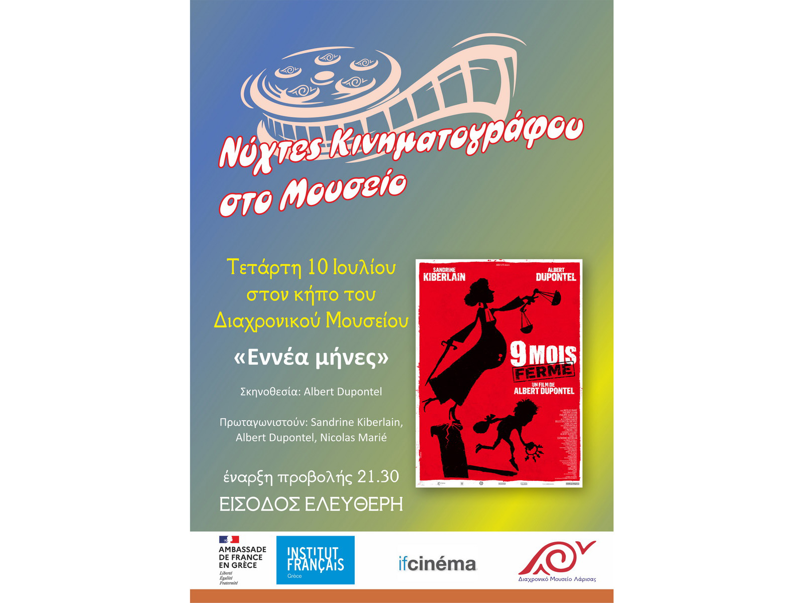 Εννέα μήνες (9 MOIS FERME, Γαλλία, 2013, 82′) με τους Sandrine Kiberlain, Albert Dupontel, Nicolas Marié. Πρόκειται για μια μαύρη κωμωδία του Albert Dupontel που απέσπασε πολλές και σπουδαίες διακρίσεις, μεταξύ των οποίων βραβείο CESAR 2014 πρωτότυπου σεναρίου και Α΄ γυναικείου ρόλου.