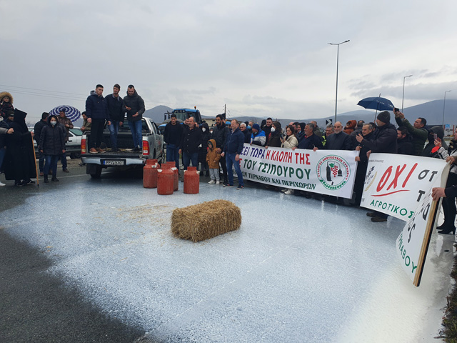 Οι κτηνοτρόφοι στηρίζουν τους αγρότες ρίχνοντας το γάλα τους στο μπλόκο του Τυρνάβου