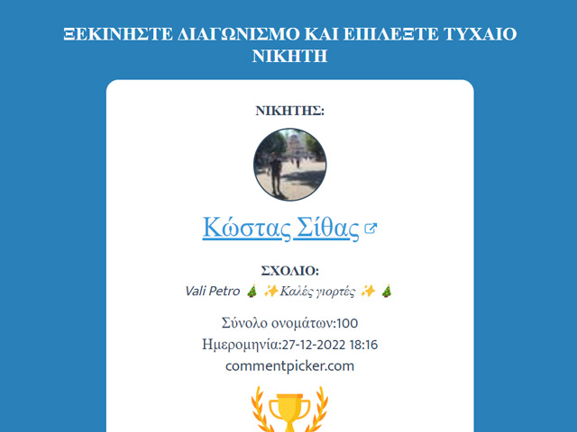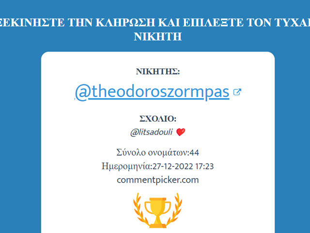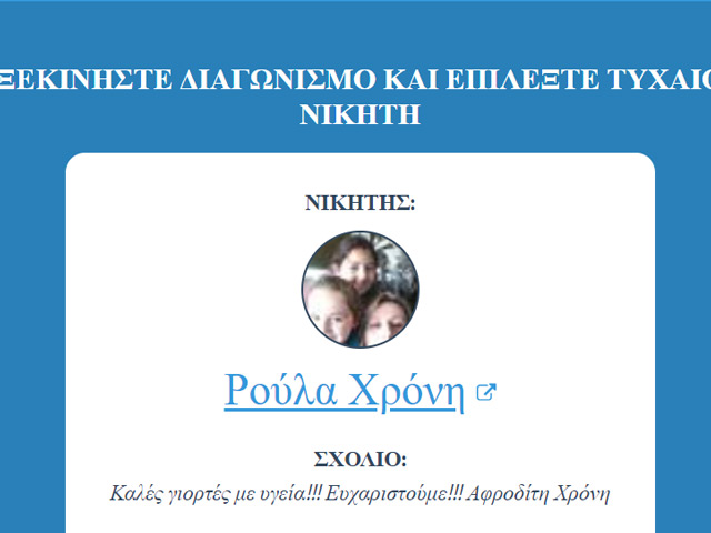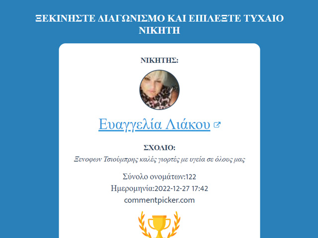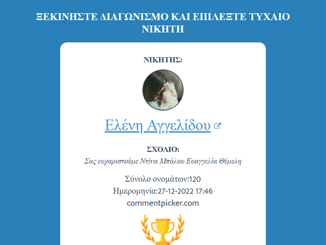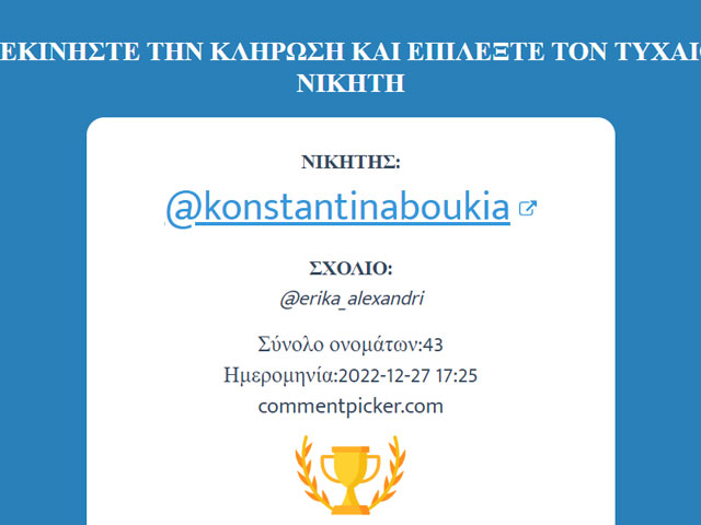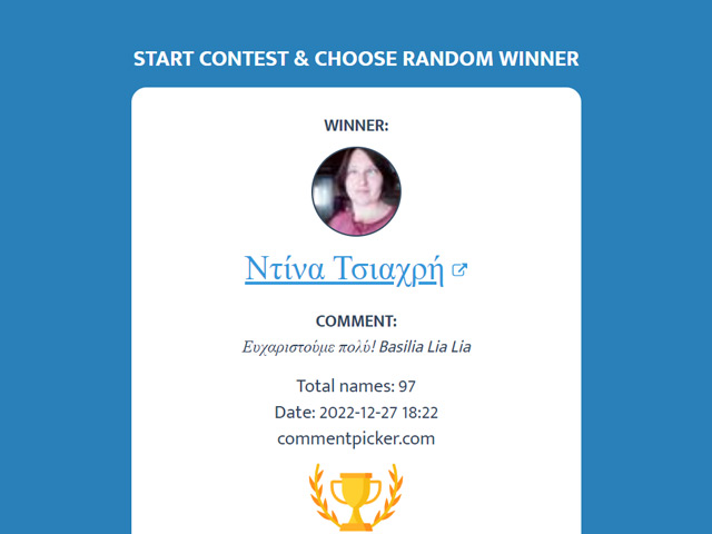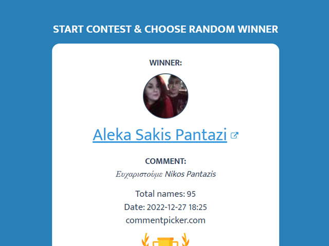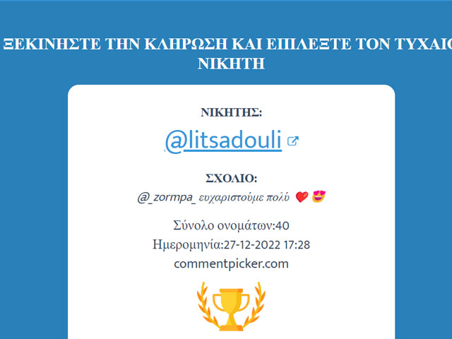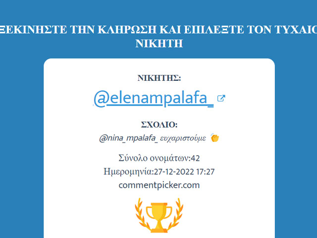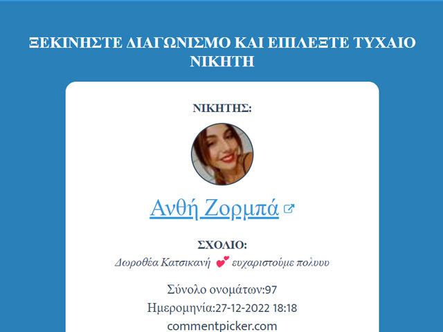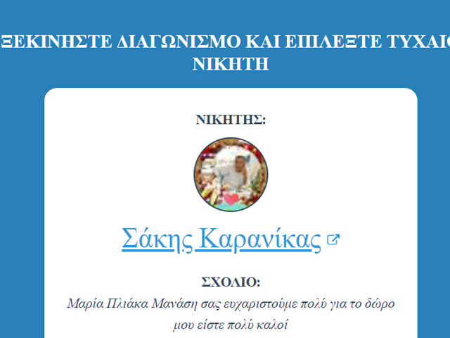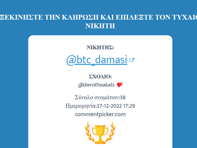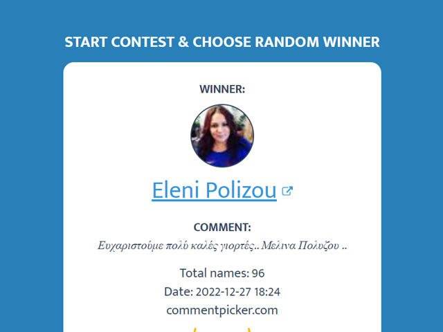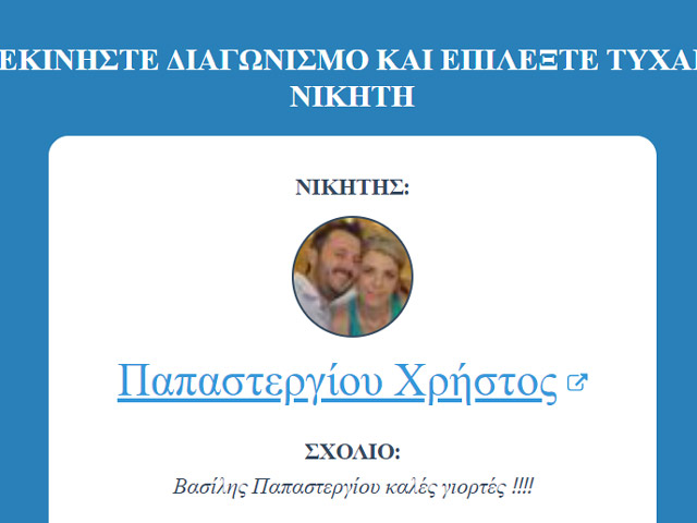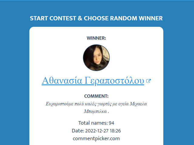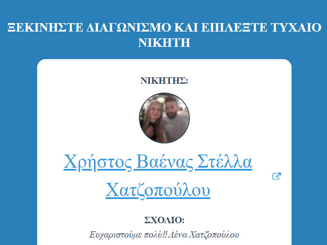 Μετά από κλήρωση που πραγματοποιήθηκε από εφαρμογή και εφόσον είχανε κάνει όλα τα βήματα του διαγωνισμού, ανακοινώνουμε με μεγάλη χαρά τους τυχερούς που κερδίζουν τα δώρα των χορηγών μας: