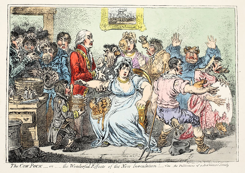 Αυτή η (ευρέως γνωστή) γελοιογραφία από το 1802 αποτυπώνει το πώς ο δαμαλισμός (δηλαδή ο εμβολιασμός με τον συγγενικό στην ευλογιά ιό της δαμαλίτιδας που προσβάλει της αγελάδες και προστατεύει από τον ιό της ευλογιάς) είχε εξάψει την φαντασία του κόσμου για παραμορφωτικές παρενέργειες.