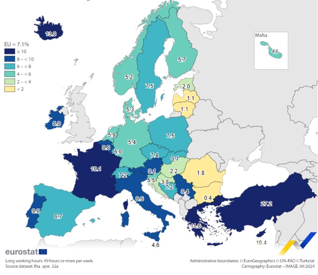 Συνολικά το 2023, το 7,1% των απασχολουμένων στην ΕΕ έκαναν υπερωρίες στην κύρια εργασία τους (πέρασαν 49 ή περισσότερες ώρες εβδομαδιαίως στη δουλειά). Μετά την «πρωταθλήτρια» Ελλάδα (11,6%), δεύτερη αναδείχθηκε η Κύπρος (10,4%) και τρίτη η Γαλλία (10,1%). Αντιθέτως, τα χαμηλότερα ποσοστά καταγράφηκαν στη Βουλγαρία (0,4%), τη Λιθουανία και τη Λετονία (1,1% έκαστη).