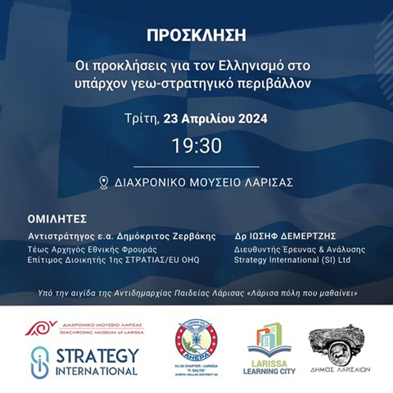 «Οι προκλήσεις για τον Ελληνισμό στο υπάρχον γεωστρατηγικό περιβάλλον» την Τρίτη 23 Απριλίου 2024 και ώρα 19:30 στο Διαχρονικό Μουσείο Λάρισας.