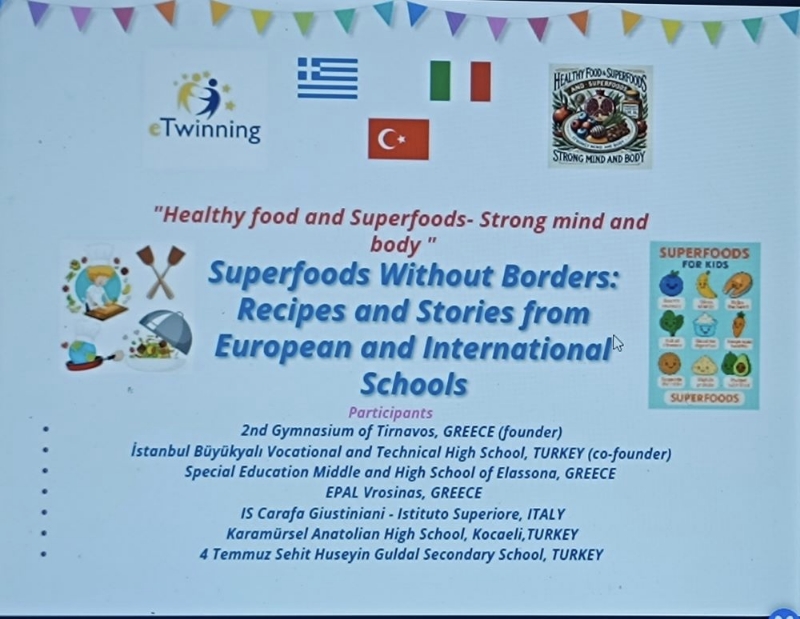 Το 2ο Γυμνάσιο Τυρνάβου ολοκλήρωσε με επιτυχία το Ευρωπαϊκό πρόγραμμα eTwinning με τίτλο “Healthy Food and Superfoods – Strong Mind and Body”, το οποίο υλοποιήθηκε με τη συμμετοχή επτά σχολείων από τρεις ευρωπαϊκές χώρες – Ελλάδα (3 σχολεία), Τουρκία (3 σχολεία) και Ιταλία (1 σχολείο).