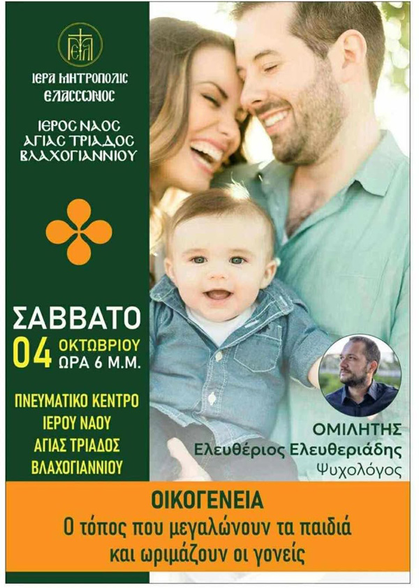 Η Ιερά Μητρόπολις Ελασσώνος και ο Ιερός Ναός Αγίας Τριάδος Βλαχογιαννίου σας προσκαλούν σε μια ιδιαίτερη ομιλία με θέμα «ΟΙΚΟΓΕΝΕΙΑ: Ο τόπος που μεγαλώνουν τα παιδιά και ωριμάζουν οι γονείς».
