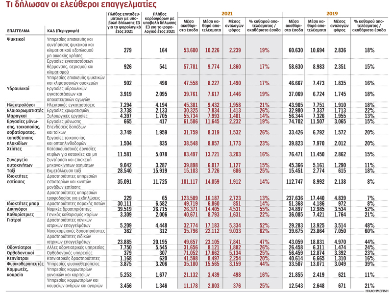 Ιδιοκτήτες μπαρ. Από τους 30.111 ιδιοκτήτες που δραστηριοποιούνται στον κλάδο, το 65% αυτών δήλωσε ζημίες, το 13% είχε μηδενικά αποτελέσματα, ενώ το υπόλοιπο 22% εμφάνισε κέρδη στην εφορία. Συγκεκριμένα, οι 6.582 που εμφάνισαν κέρδη δήλωσαν: Μέσα ακαθάριστα έσοδα ύψους 49.719 ευρώ και μέσα καθαρά κέρδη 6.860 ευρώ. Κατέβαλαν φόρο ύψους 851 ευρώ. Επί της ουσίας μόλις το 14% των ακαθάριστων εσόδων έμεινε στους ιδιοκτήτες μπαρ. Το 2019 οι ιδιοκτήτες μπαρ είχαν δηλώσει μέσα ακαθάριστα έσοδα ύψους 51.368 ευρώ και καθαρά 4.168 ευρώ. Δηλαδή, μόλις το 8% των ακαθάριστων αποτελεσμάτων.
