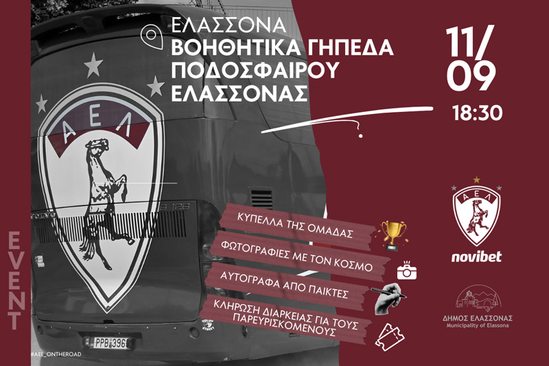 Η εκδήλωση για την ποδοσφαιρική ομάδα της Α.Ε.Λ. θα πραγματοποιηθεί την Πέμπτη 11 Σεπτεμβρίου στις 18:30 στα Βοηθητικά Γήπεδα Ποδοσφαίρου Ελασσόνας (απέναντι από τα Κ.Τ.Ε.Λ.) και θα είναι ανοιχτή για το κοινό.